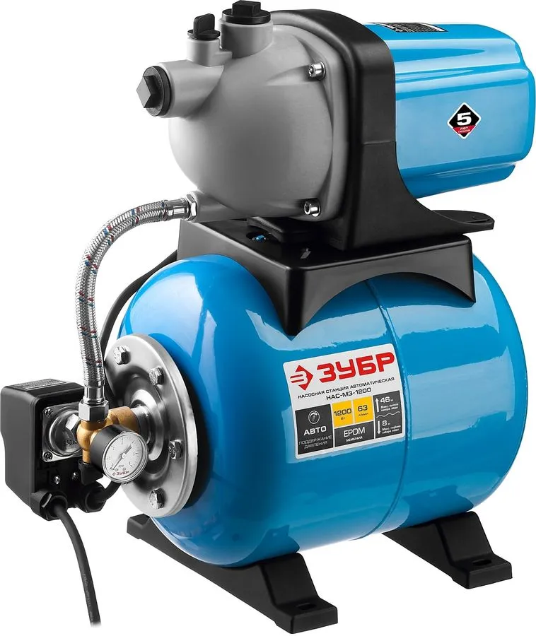 Тип - насосная станция; Мощность, Вт - 1200; Производительность, л/мин - 63; Напор, м - 46; Макс. давление, Атм - 4,6; Объем гидроаккумулятора, л - 20; Макс. глубина забора, м - 8; Допустимая температура жидкости, °С - 35; Автоматическое поддержание давления - есть; Габариты, см - 53x35x59;