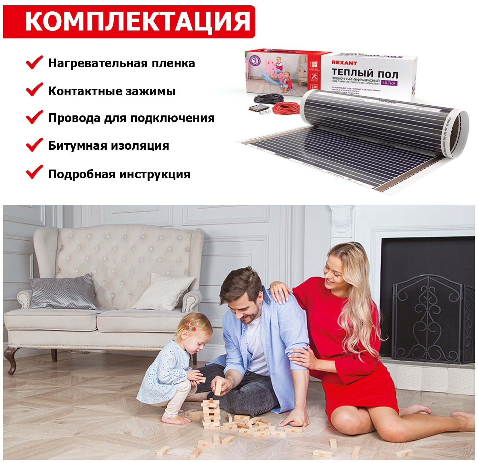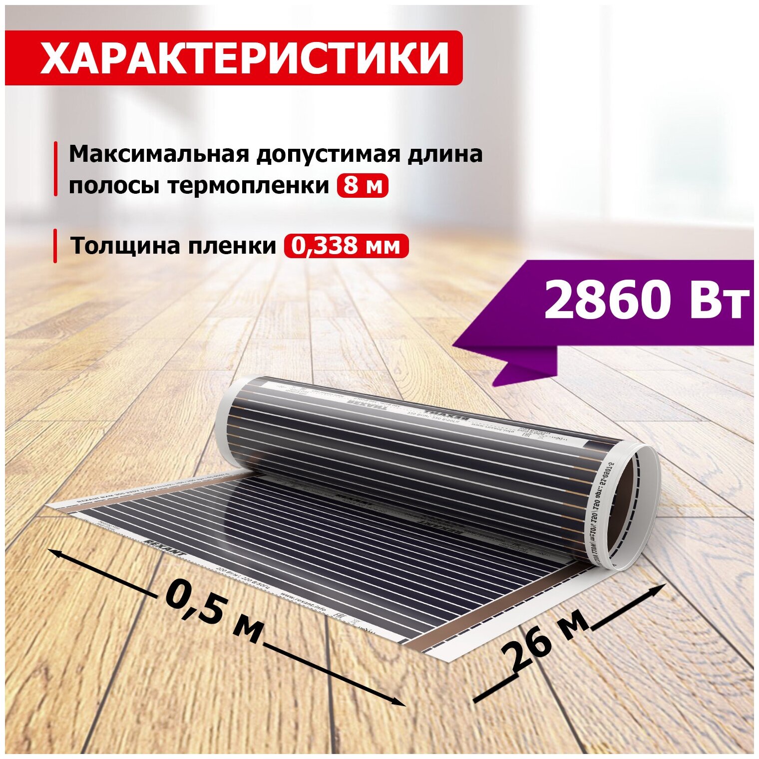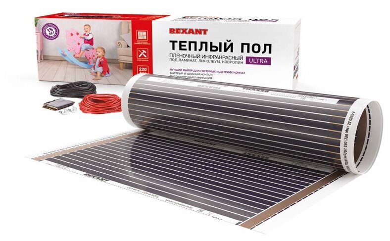 Тип - инфракрасный пленочный пол; Удельная мощность - 220 Вт/м²; Номинальное напряжение - 230В; Применение - под ковролин, под ламинат, под линолеум, под паркет, под стяжку/плитку; Дополнительная информация - не увеличивает высоту пола; укладывается без стяжки и клея;