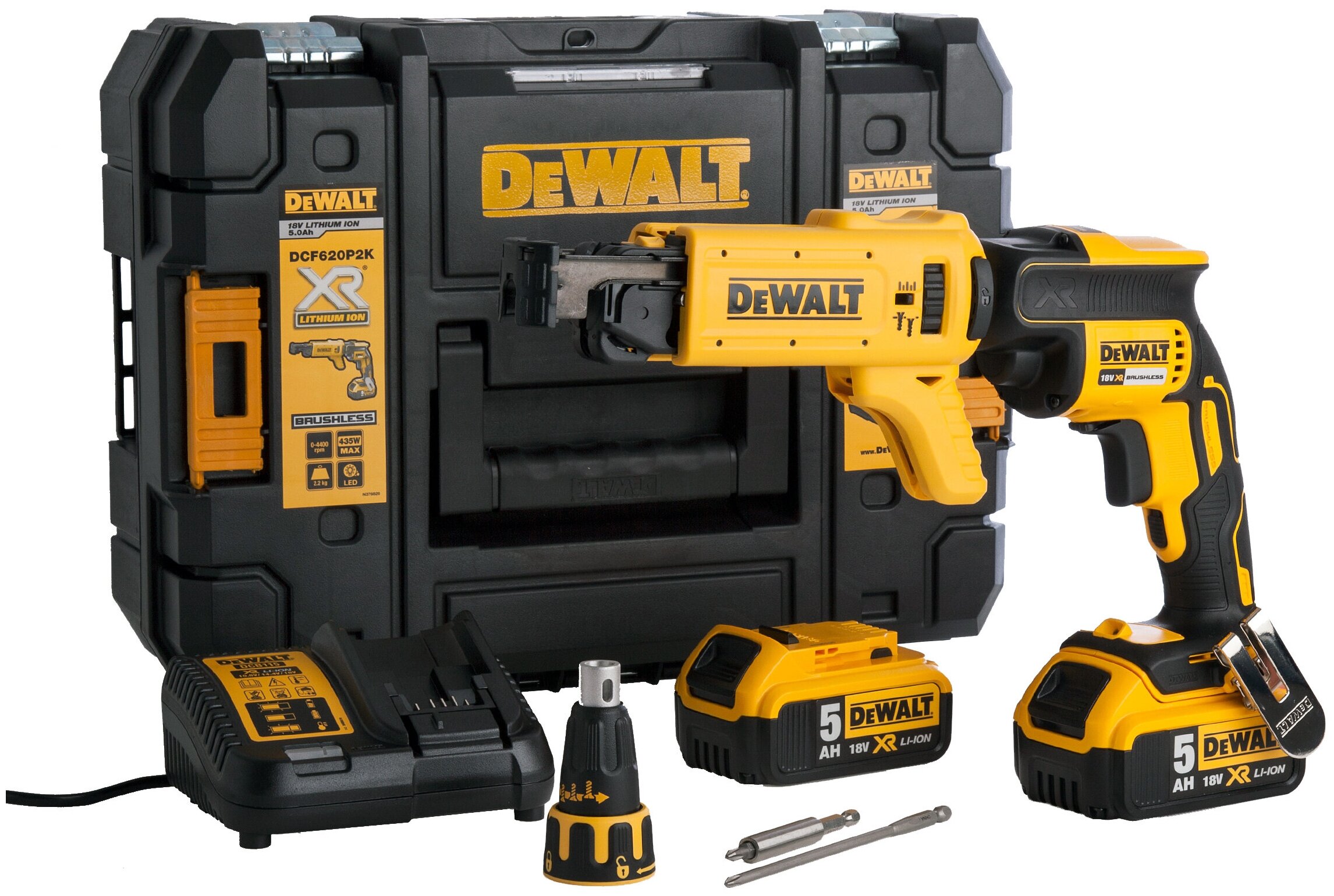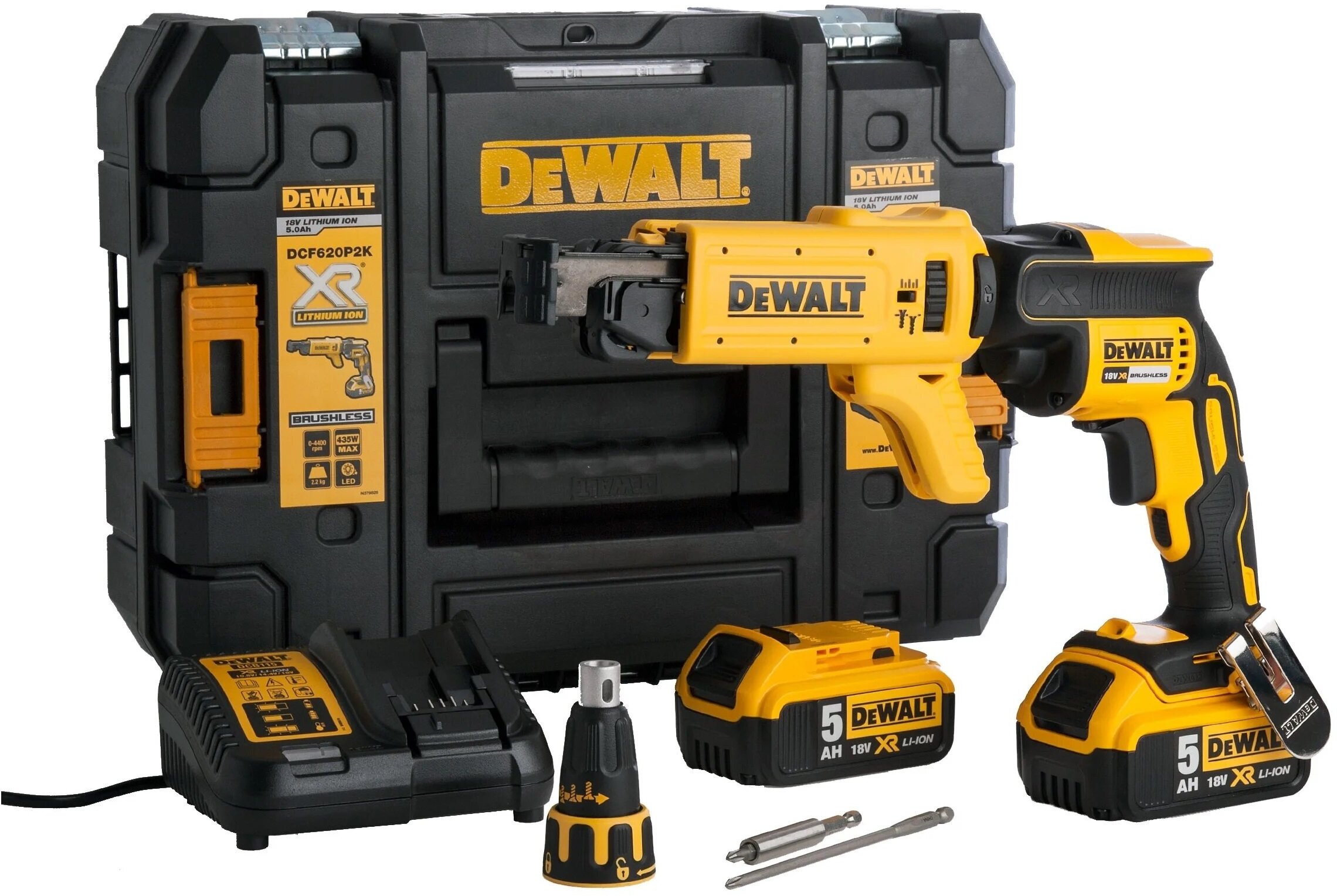 Подробная комплектация 2 аккумуляторные батареи 18В 5АЧ, зарядное устройство, насадка ленточная, бита, магнитный удлинитель, кейс TSTAK