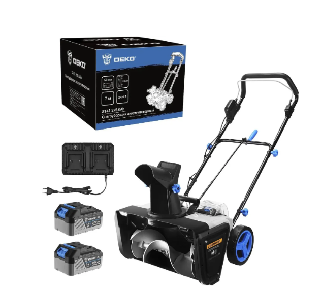 Тип - снегоуборщик аккумуляторный; Тип двигателя - электрический; Тип электропитания - от аккумулятора; Тип шасси - колесное; Дальность выброса снега - до 7 м; Тип электрического двигателя - бесщеточный; Количество аккумуляторов в комплекте - 2; Емкость аккумулятора - 5 Ач; Напряжение аккумулятора - 20 В; Время работы от аккумулятора - 30 мин; Ширина захвата - 50 см; Высота захвата - 25 см; Размер