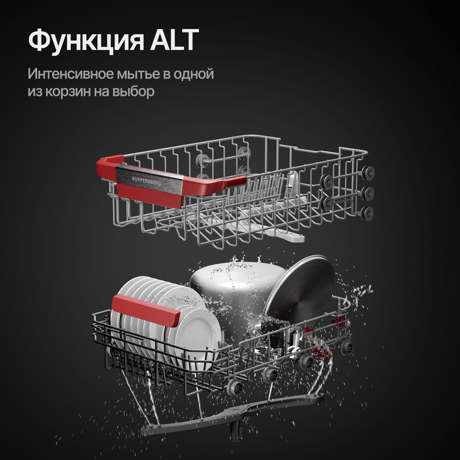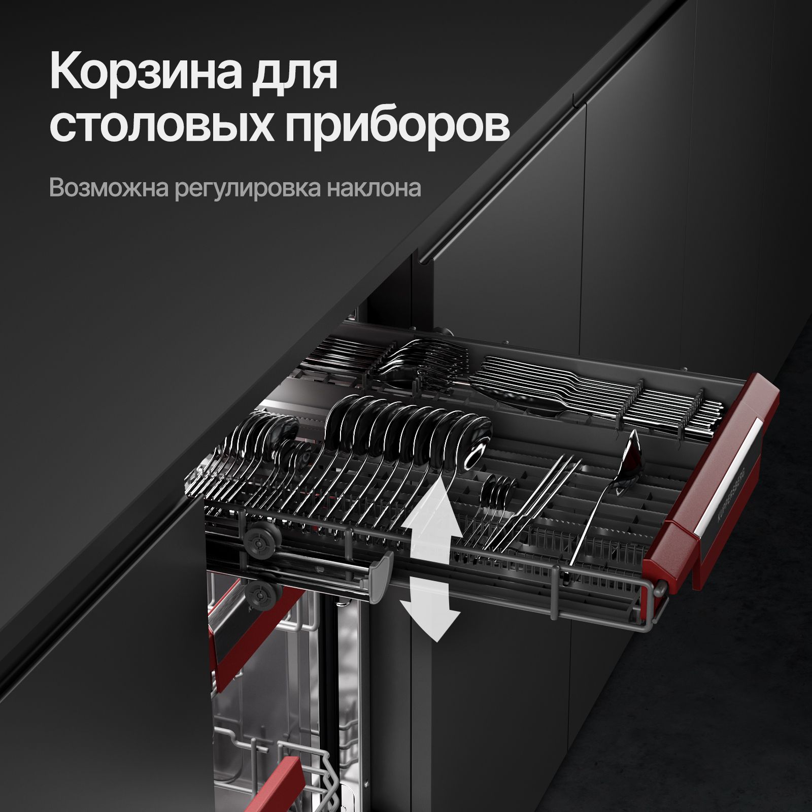 Особенности посудомоечной машины Автоматическое открывание двери,Внутреннее освещение,Дисплей,Поддон для столовых приборов,Полка для чашек,Регулировка высоты корзин,Съемные контейнеры для столовых приборов,Съемные насадки разбрызгивателей