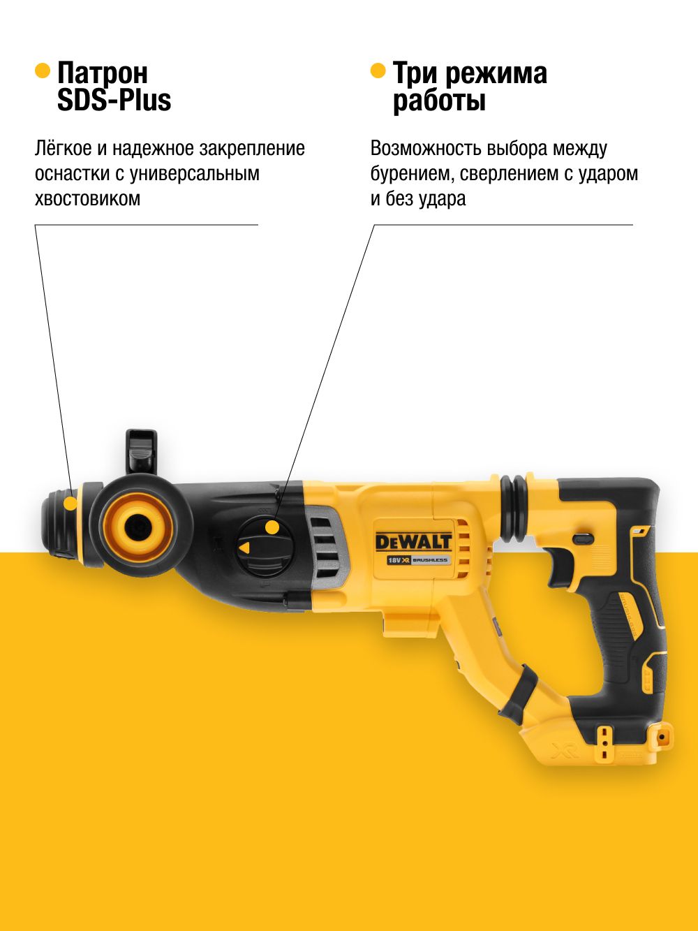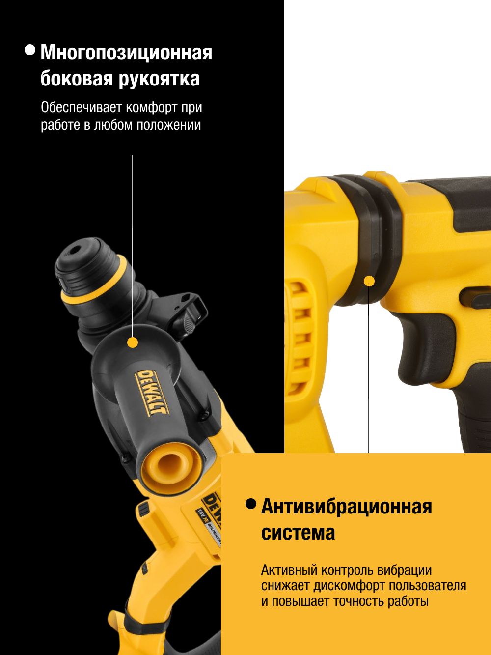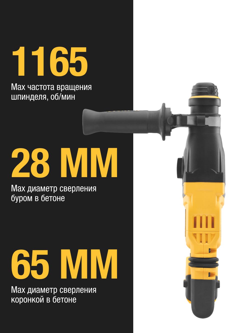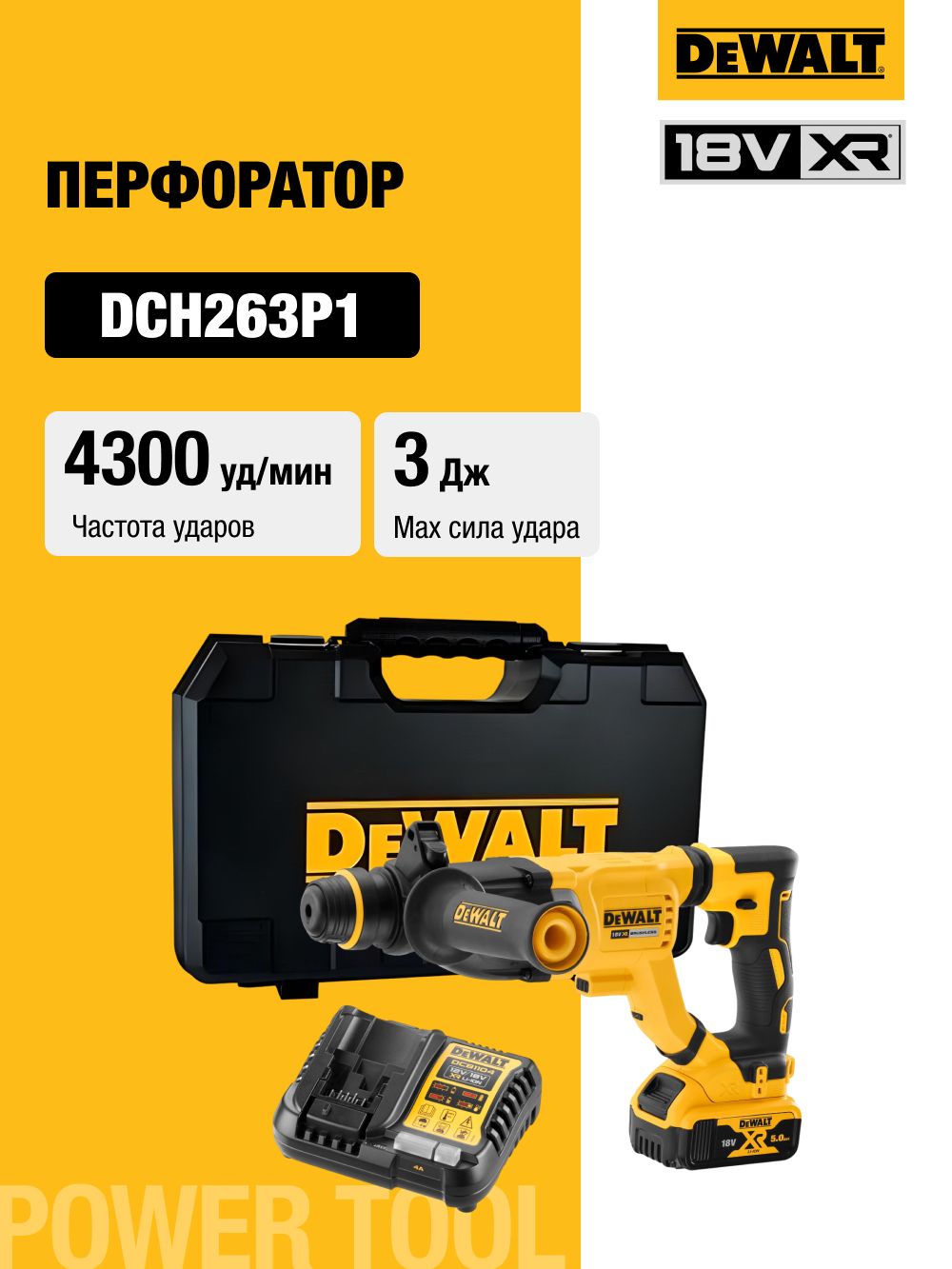 Тип - Перфоратор; Количество ударов, уд./мин - 4300; Цвет - Желтый,черный; Макс. энергия удара, Дж - 3; Макс. обороты на 1ой скорости, об./мин - 1165; Макс. диаметр отверстия в стали, мм - 13; Макс. диаметр отверстия в бетоне, мм - 28; Макс. диаметр отверстия в дереве, мм - 30; Количество скоростей - 1; Тип питания - От аккумулятора; Емкость, А•ч - 5; Напряжение аккумулятора - 18 В; Расположение д