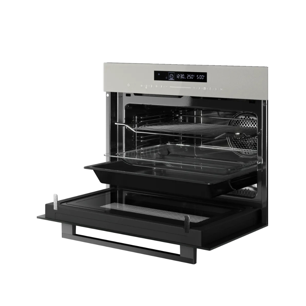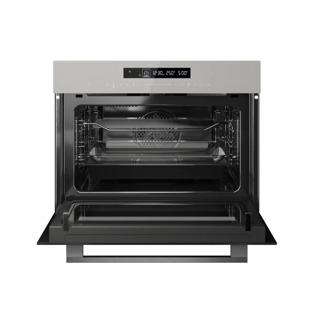 Цвет - Серый; - ; Тип питания - Электрический; Тип управления - Сенсорное; Объем духовки, л - 50; Максимальная температура, °C - 250; Мощность микроволн, Вт - 900; Функционал духовки - Гриль, Конвекция; Очистка духовки - Очистка паром; Количество стекол дверцы духовки - 4; Количество режимов работы - 13; Режимы работы - Микроволны, гриль, конвекция, режим пицца, нижний нагрев, традиционный нагрев