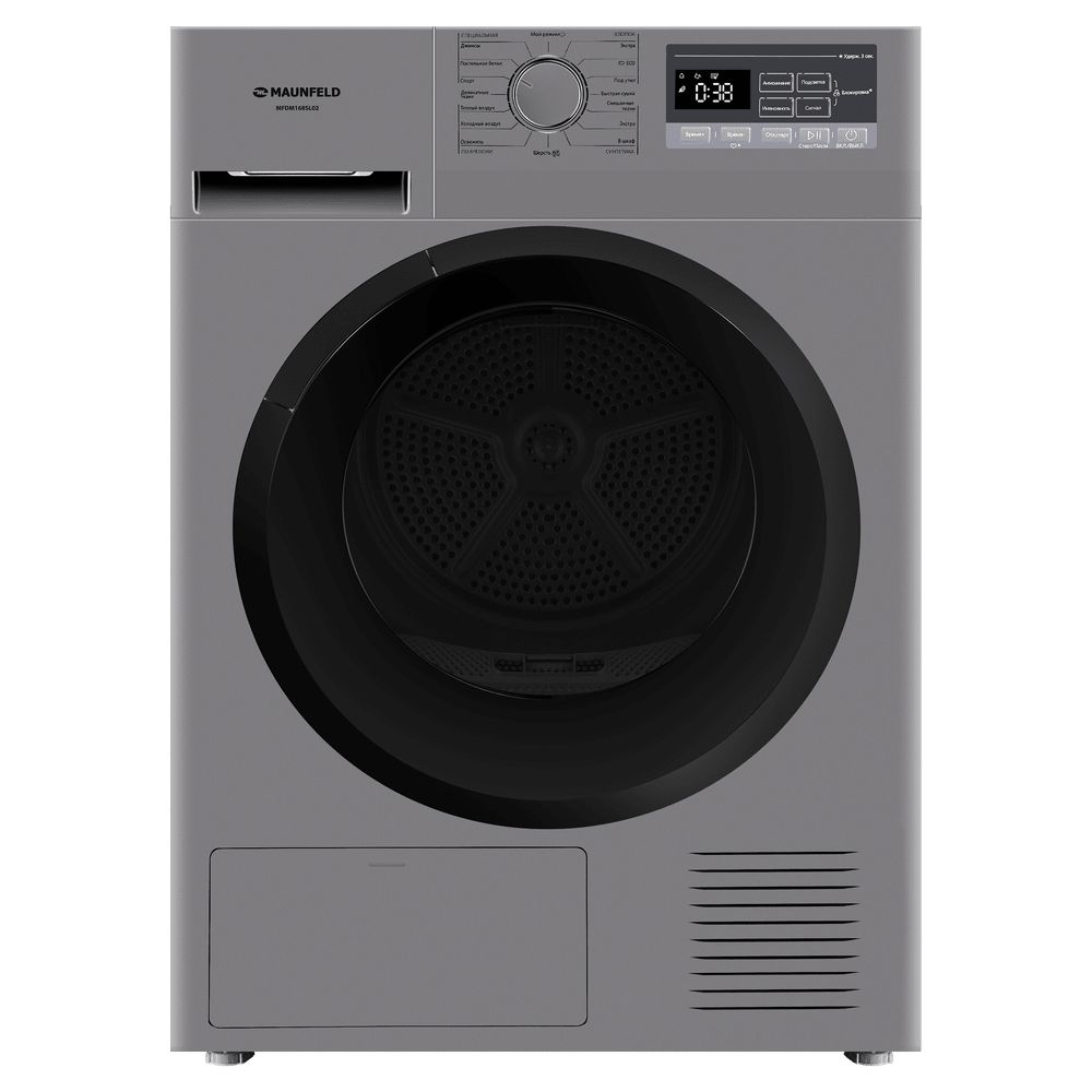 Тип загрузки - Фронтальная; Загрузка белья для сушки, кг - 8; Количество программ сушки - 16; Размеры, мм (ШхГхВ) - 595х610х845; Тип сушки - С тепловым насосом; Класс энергопотребления - A+; Управление - Электронное; Отложенный старт, ч - 24; Системы защиты - Блокировка от детей; Тип - Сушильная машина; Цвет - Серый; Класс отжима - B; Уровень шума при отжиме, дБ - 66; Особенности конструкции - Осв