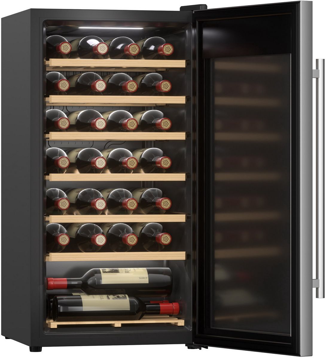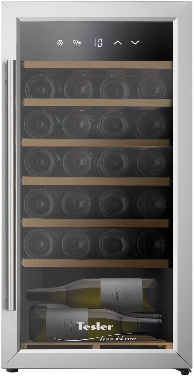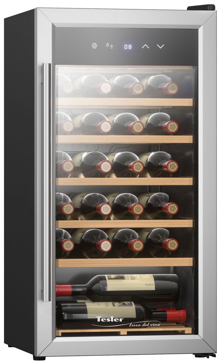 Общий объем, л - 80; Количество бутылок, шт - 27; Размеры, мм (ШхГхВ) - 430х450х840; Класс энергопотребления - B; Автономное сохранение холода, ч - 5; Макс. уровень шума, дБ - 42; Количество камер - 1; Климатический класс - SN-T +10°C / +43°C; Открывание дверей - Вправо; Тип - Винный шкаф; Цвет - Черный; Количество температурных зон - 1; Тип охлаждения - Компрессорный; Хладагент - R600A; Управлени