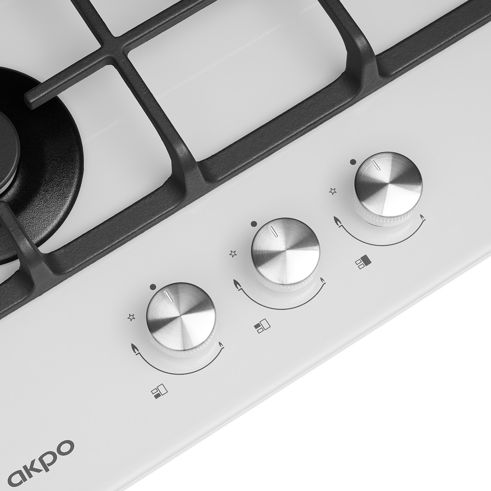 Цвет - Белый; Размер для встраивания (В*Ш*Г) (мм) - 30х410х480; Размер устройства (В*Ш*Г) (мм) - 95х450х510; Вес, кг - 10,1; Управление - кнопочное + поворотный регулятор; Количество конфорок (шт) - 3; Материал поверхности - Закаленное стекло 8 мм; Газ-контроль - есть; Электроподжиг - есть; Материал решеток - чугун; Особенности - поворотные регуляторы / газ-контроль каждой конфорки / WOK-конфорка