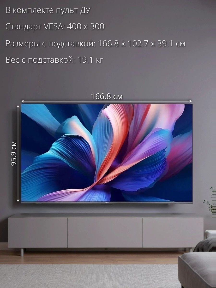 Обязательные программы предустановлены - Не указано; Диагональ экрана, дюймы - 75; Разрешение - 3840x2160 4K; Smart TV - Да; Тип подсветки - Direct LED; Беспроводные интерфейсы - Bluetooth,Wi-Fi; Частота обновления - 120 Гц; Операционная система ТВ - Google TV; Число портов HDMI - 3; Стандарт крепления VESA - 400x300 мм; Гарантийный срок - 1 год; Тип - Телевизор; Цвет - Черный; Диагональ экрана, с