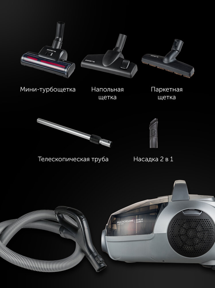 Мощность всасывания, Вт - 650; Потребляемая мощность, Вт - 2200; Вид пылесборника - Контейнер; Тип уборки - Сухая; Объем пылесборника, л - 2.2; Вид фильтра - Циклонный; Тип трубки - Телескопическая; Макс. уровень шума, дБ - 78; Тип - Напольный пылесос; Цвет - Серый,серебристый; Количество насадок - 4; Материал трубки - Металл; Вид питания - От сети 220В; Размеры, мм - xx; Вес товара, г - 7950; Гар