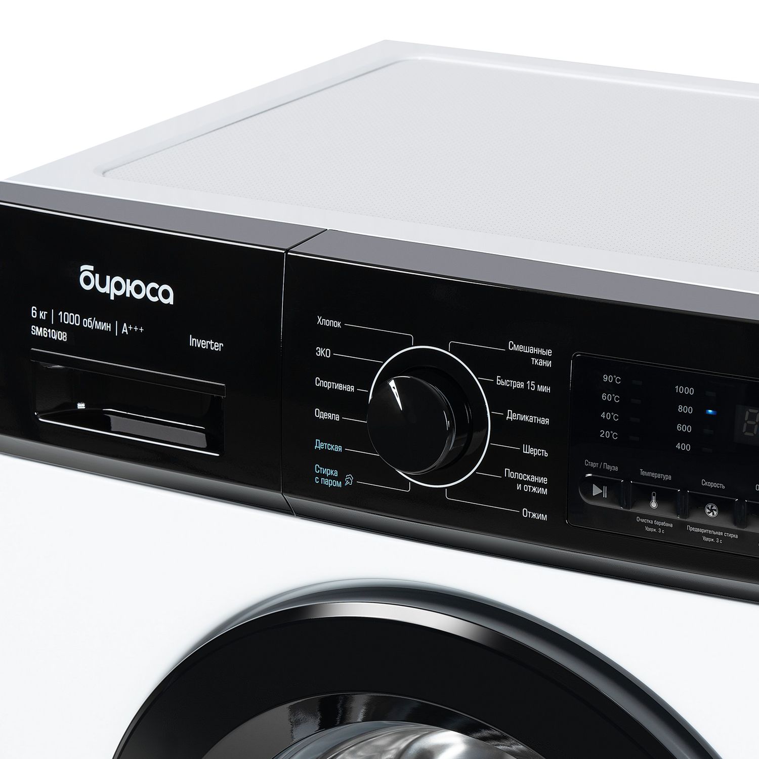 Программы стирки Стирка деликатных тканей,Стирка изделий из хлопка,Стирка изделий из шерсти,Стирка смешанных тканей,Быстрая стирка,Отжим,Полоскание + отжим,Стирка детской одежды,Стирка одеял,Стирка спортивной одежды