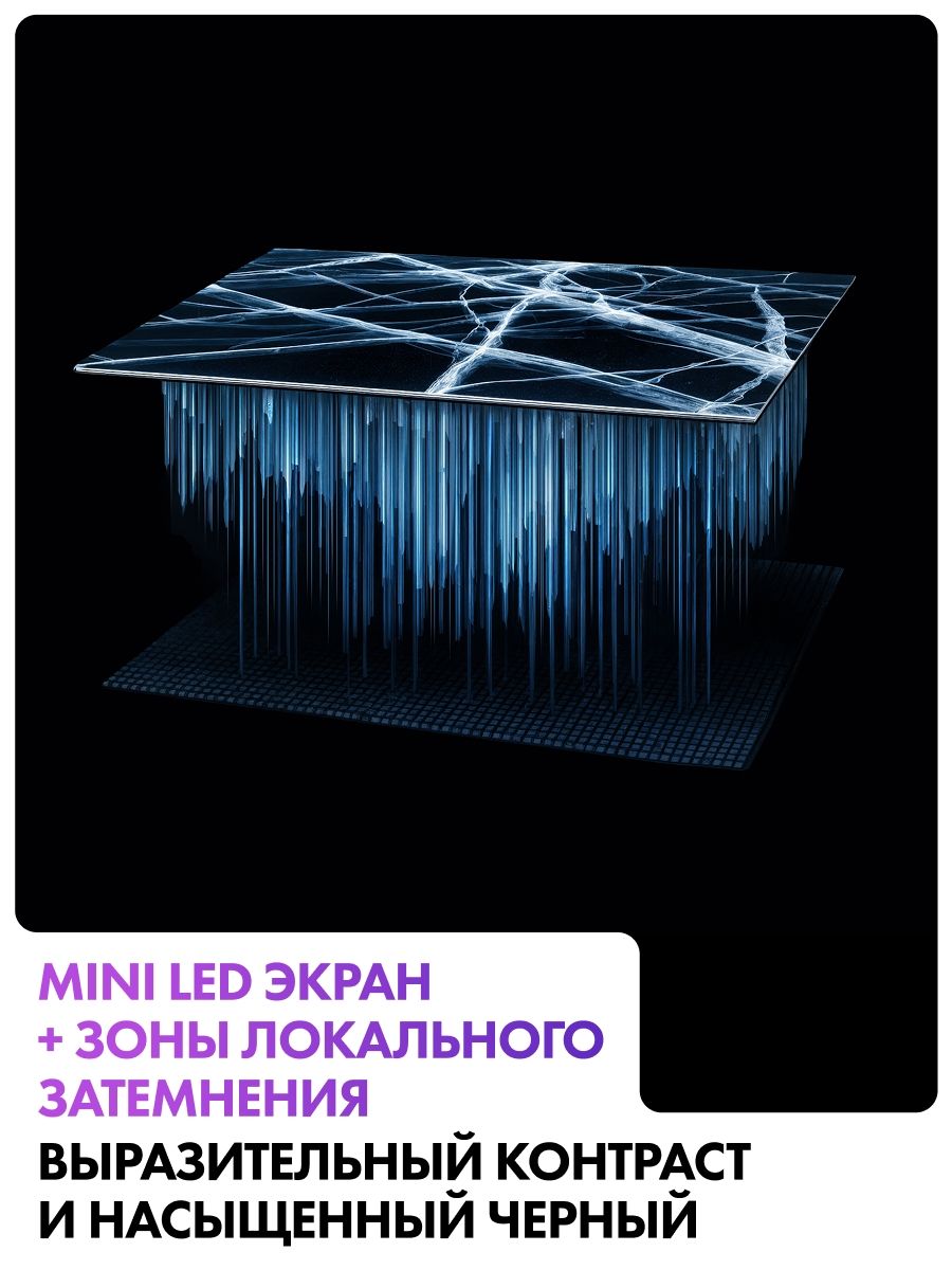 Обязательные программы предустановлены - Нет; Диагональ экрана, дюймы - 65; Разрешение - 3840x2160 4K; Smart TV - Да; Тип подсветки - Mini LED; Беспроводные интерфейсы - Bluetooth,Wi-Fi; Частота обновления - 60 Гц; Операционная система ТВ - Android TV; Стандарт крепления VESA - 600x300 мм; Технология матрицы ТВ - VA; Гарантийный срок - 1 год; Тип - Телевизор; Цвет - Серебристый; Диагональ экрана,