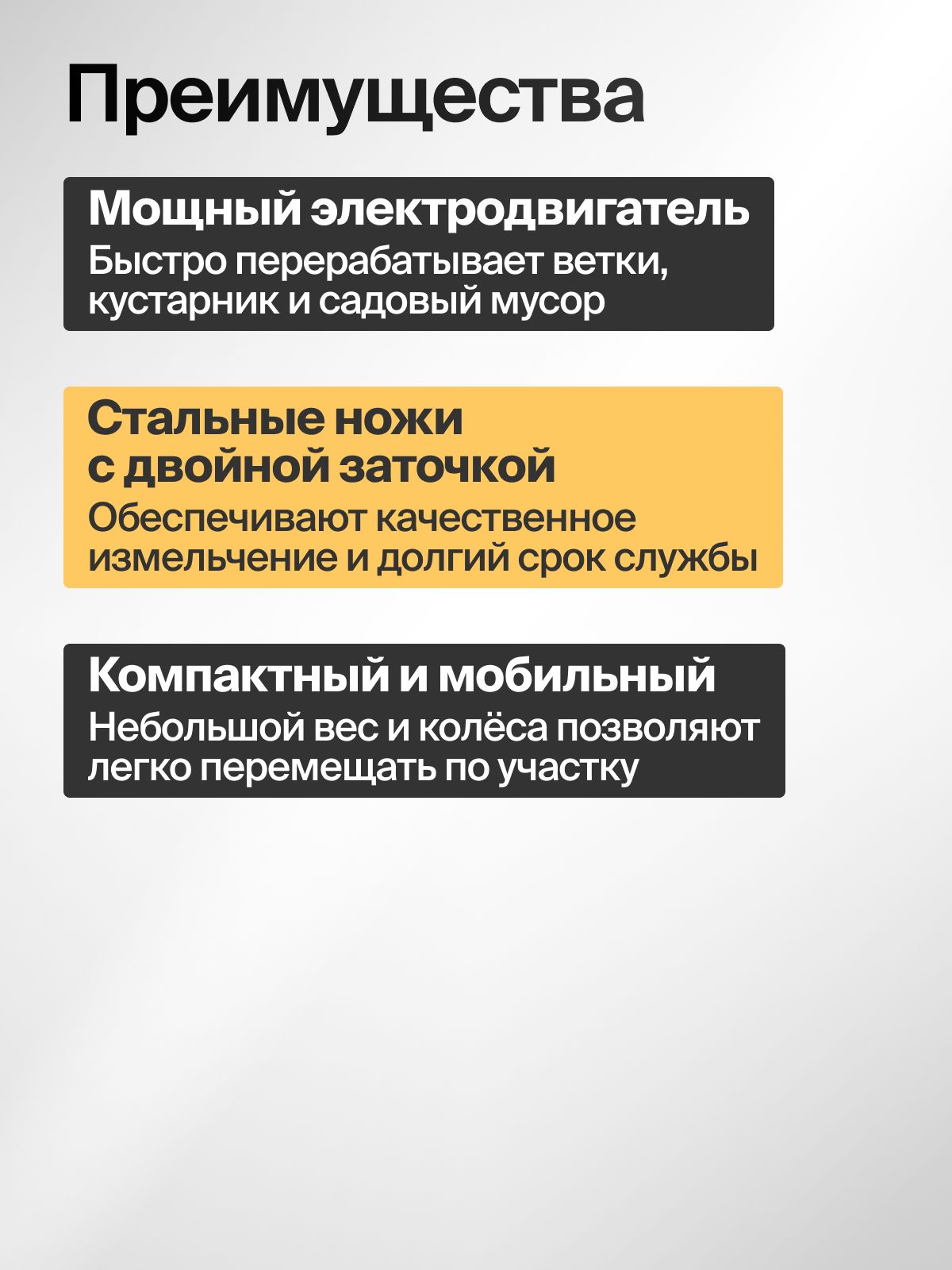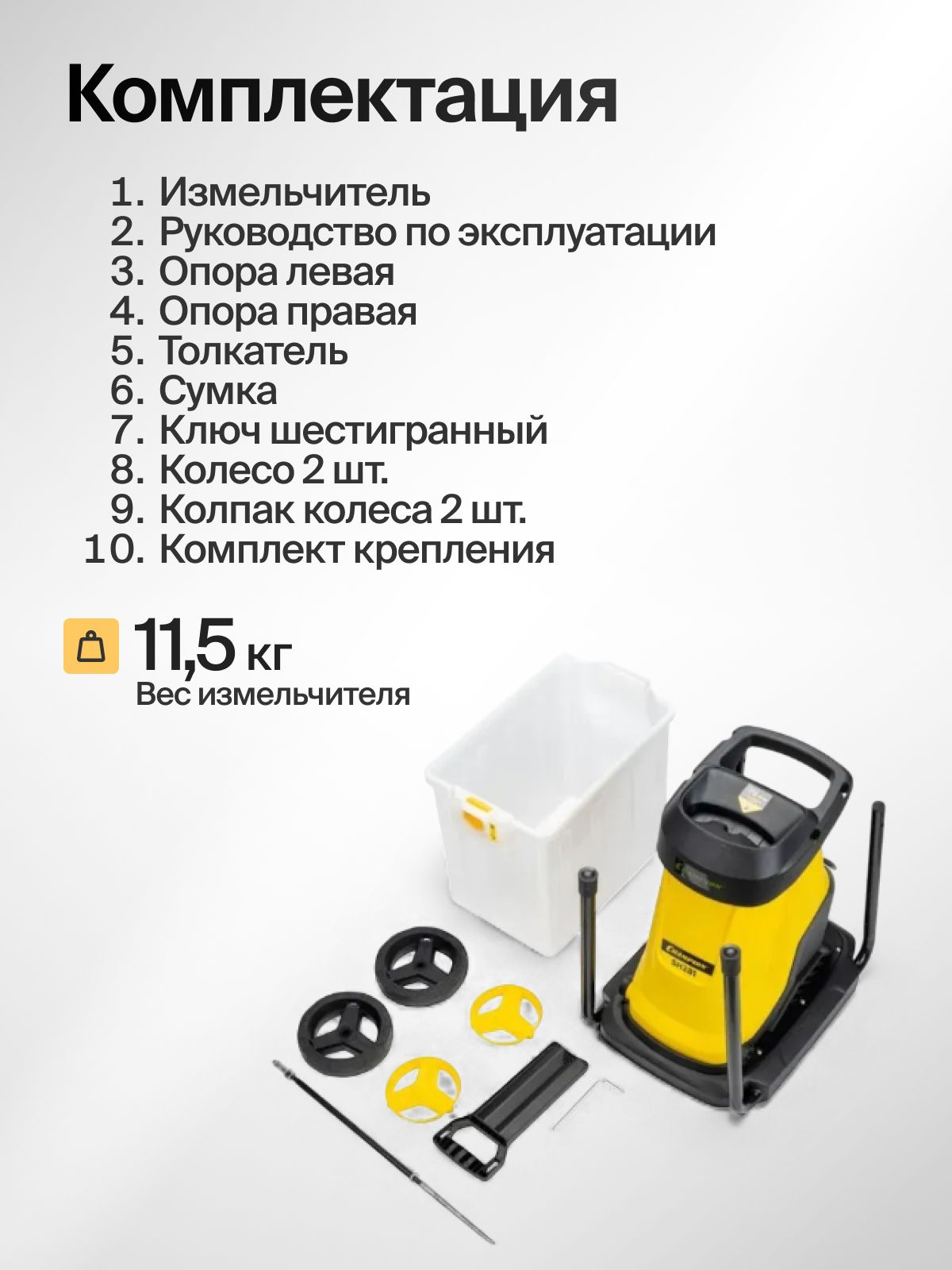 Тип - Садовый измельчитель; Тип двигателя - Электродвигатель; Тип питания - От сети; Мощность, Вт - 2800; Мощность, л.с. - 3.8; Объем травосборника, л - 50; Особенности - Колеса; Вес, кг - 11.5; Макс. обороты холостого хода, об/мин - 4500; Цвет - Желтый; Вес товара, г - 11500;