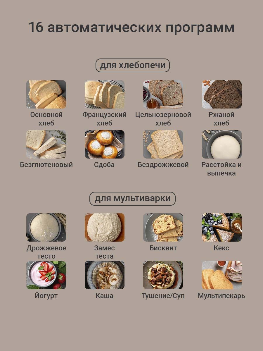 Программы хлебопечения Французский хлеб,Цельнозерновой хлеб,Сдоба,Безглютеновый хлеб,Ржаной хлеб,Замес с изменением времени,Дрожжевое тесто
