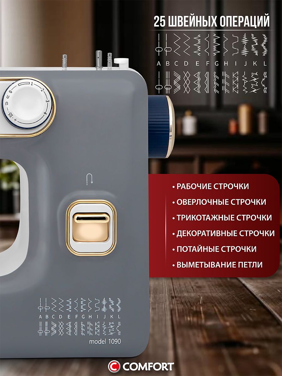 Тип управления - Электромеханическое; Тип челнока - Вертикальный качающийся; Режим обработки петли - Полуавтомат; Функциональные особенности швейного оборудования - Подсветка рабочей зоны,Реверс,Регулятор длины стежка; Макс. длина стежка, мм - 4; Макс. ширина стежка, мм - 5; Количество операций - 24; Оверлочная строчка - Да; Конструктивные особенности швейного оборудования - Отсек для принадлежнос