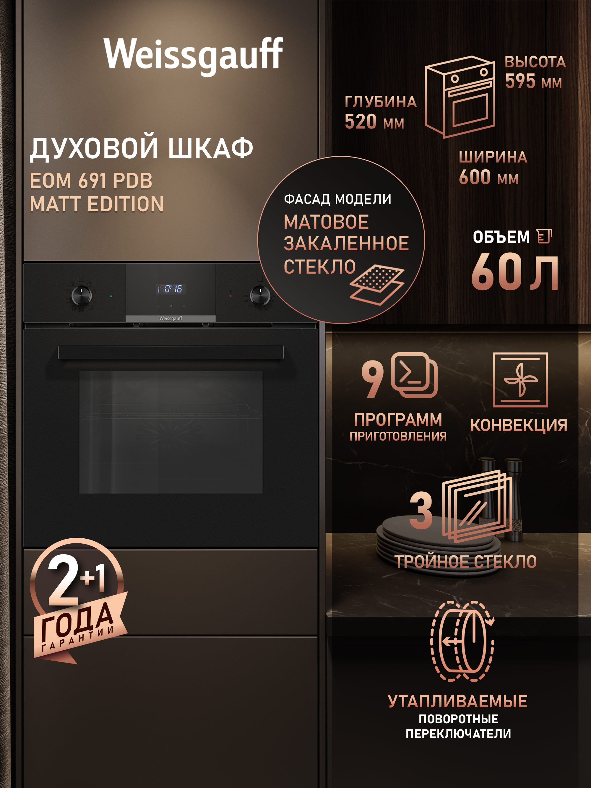 Объем духовки, л - 60; Тип установки - Независимая; Тип питания - Электрический; Количество режимов работы - 9; Управление духовкой - Таймер,Утапливаемые переключатели; Внутреннее покрытие - Эмаль; Особенности духовки, плиты - Дисплей,Встроенные часы; Количество стекол дверцы духовки - 3; Тип - Духовой шкаф; Цвет - Черный матовый; Потребляемая мощность, Вт - 2300; Класс энергоэффективности - A; Ма