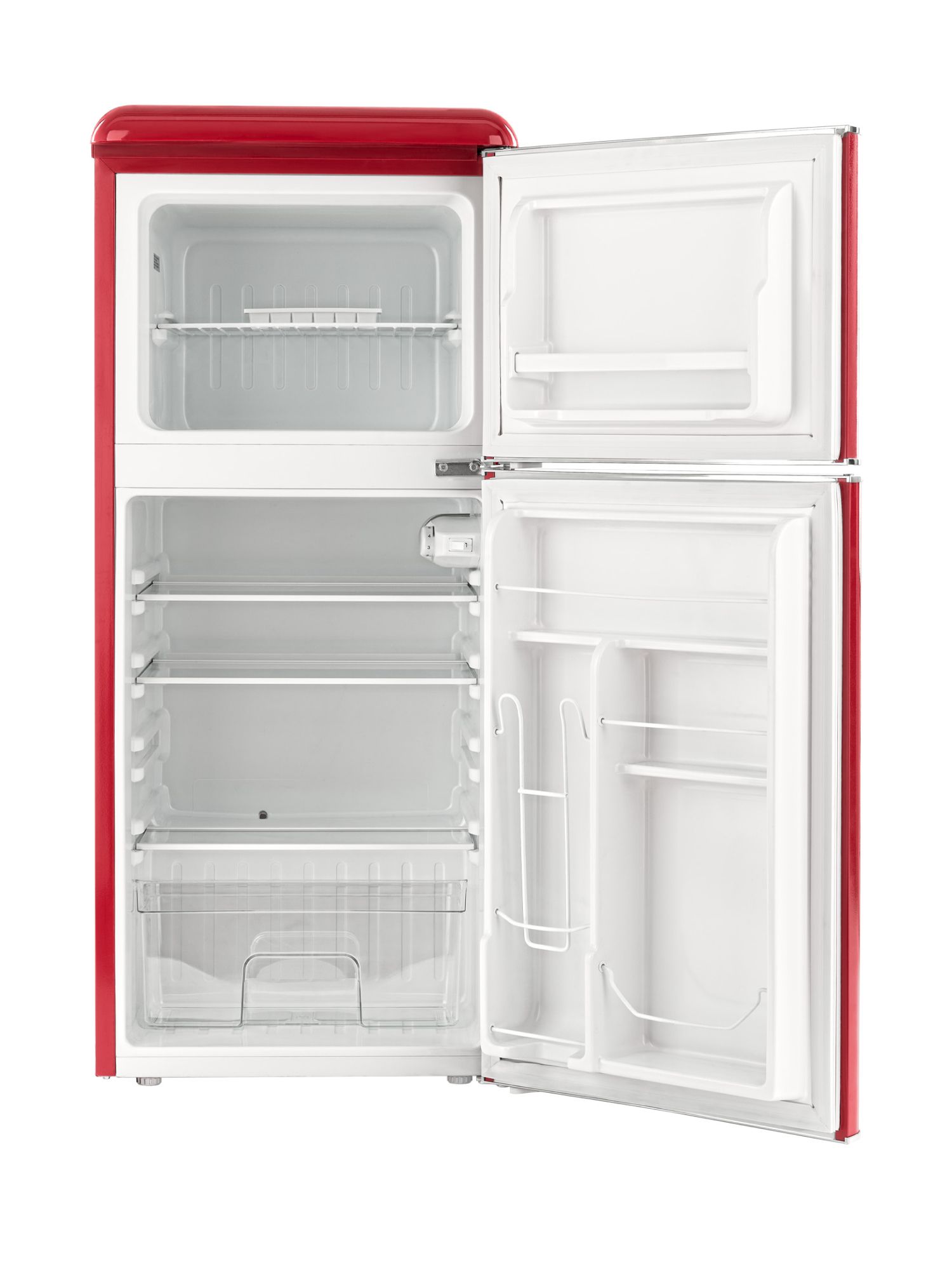 Общий объем, л - 127; Размеры, мм (ШхГхВ) - 486 x 520 x 1130; Размораживание - Капельная система; Общий объем холодильной камеры, л - 89; Класс энергопотребления - A+; Общий объем морозильной камеры, л - 38; Макс. уровень шума, дБ - 43; Количество камер - 2; Климатический класс - SN-ST +10°C / +38°C; Открывание дверей - Вправо; Тип - Холодильник; Цвет - Красный,хром; Годовое потребление, кВт ч/год