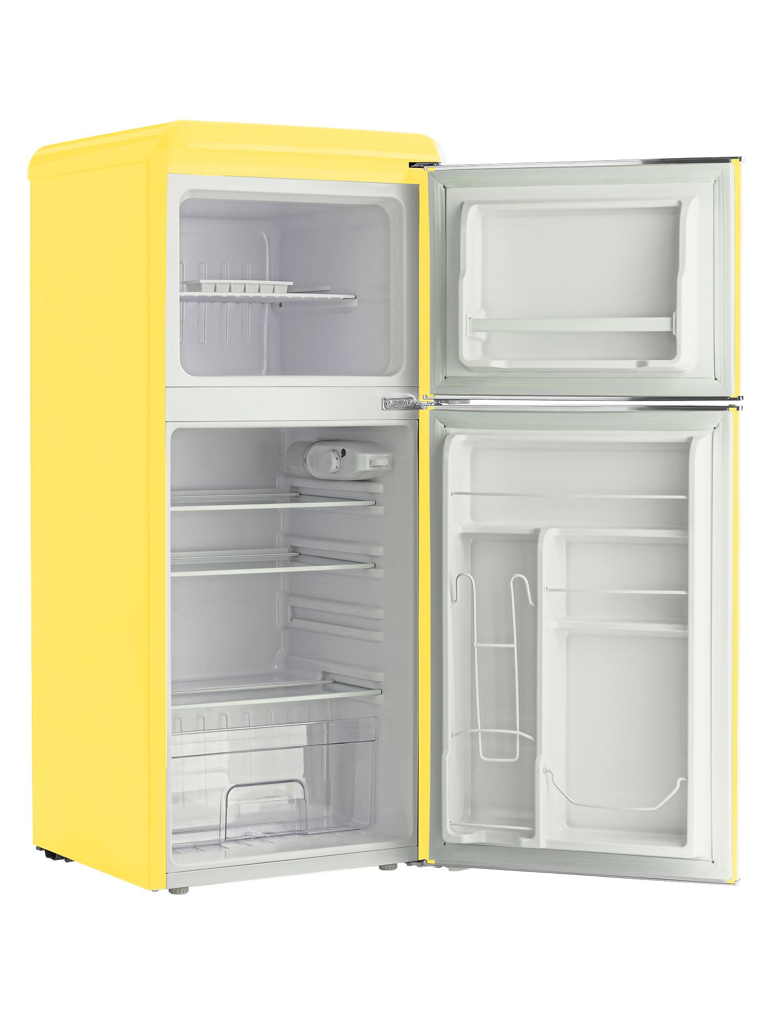Общий объем, л - 127; Размеры, мм (ШхГхВ) - 486 x 520 x 1130; Размораживание - Капельная система; Общий объем холодильной камеры, л - 89; Класс энергопотребления - A+; Общий объем морозильной камеры, л - 38; Макс. уровень шума, дБ - 43; Количество камер - 2; Климатический класс - SN-ST +10°C / +38°C; Открывание дверей - Вправо; Тип - Холодильник; Цвет - Желтый,хром; Годовое потребление, кВт ч/год