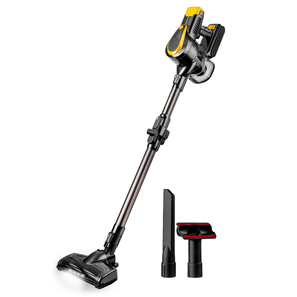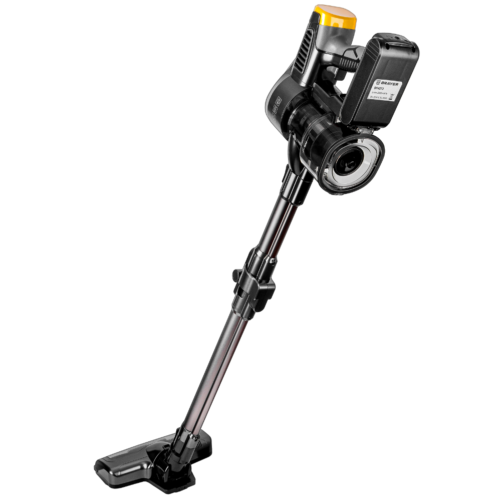Мощность всасывания, Вт - 350; Вид пылесборника - Контейнер; Тип уборки - Сухая; Время работы от аккумулятора, мин - 60; Вид насадки пылесоса - Для мебели,Для уборки пола,Щелевая насадка; Объем пылесборника, л - 0.8; Вид фильтра - HEPA; Количество насадок - 3; Количество режимов работы - 3; Макс. уровень шума, дБ - 80; Тип - Вертикальный пылесос; Цвет - Серый,желтый; Сила всасывания, Па - 23000; П
