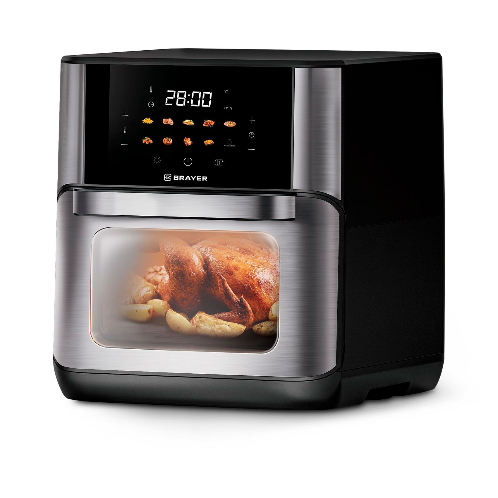 Мощность, Вт - 1800; Управление со смартфона - Нет; Автоматических программ - 10; Тип - Аэрогриль; Цвет - Черный; Объем, л - 12; Макс. температура нагрева, °С - 200; Мин. температура нагрева, °С - 80; Тип нагревателя аэрогриля - ТЭН; Особенности аэрогриля - Автоматические программы; Функционал аэрогриля - Аэрогриль; Программы приготовления - Выпечка,Картофель фри,Курица,Мясо,Пицца,Рыба; Тип управл