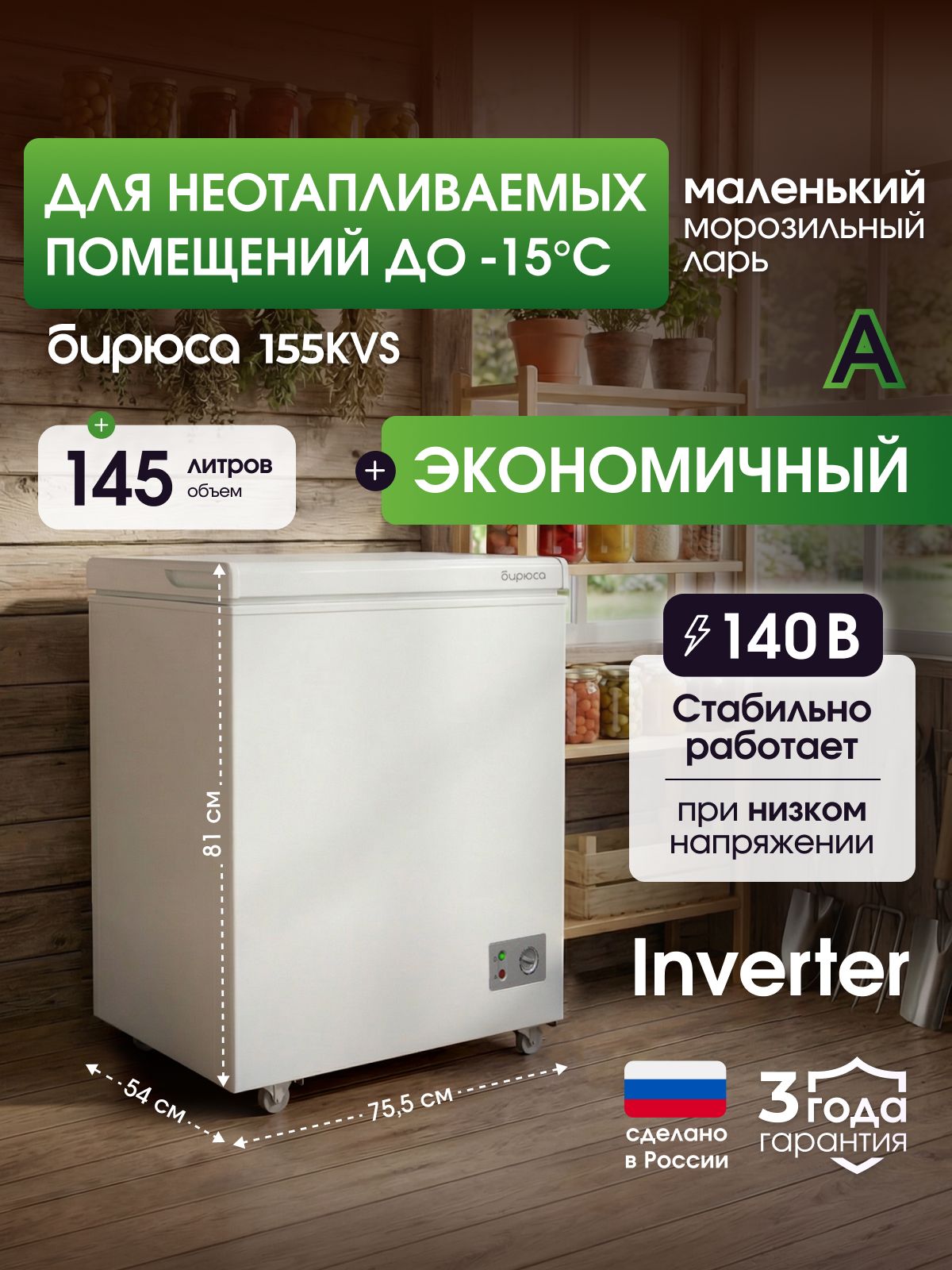 Общий объем морозильной камеры, л - 145; Размеры, мм (ШхГхВ) - 755х540х810; Мощность замораживания (кг/сут) - 11; Годовое потребление, кВт ч/год - 226; Размораживание - Ручное; Класс энергопотребления - A; Макс. уровень шума, дБ - 38; Количество камер - 1; Климатический класс - T +18°C / +43°C; Количество секций - 1; Мин. температура, °С - -18°C; Вид компрессора - Инверторный; Тип - Морозильный ла