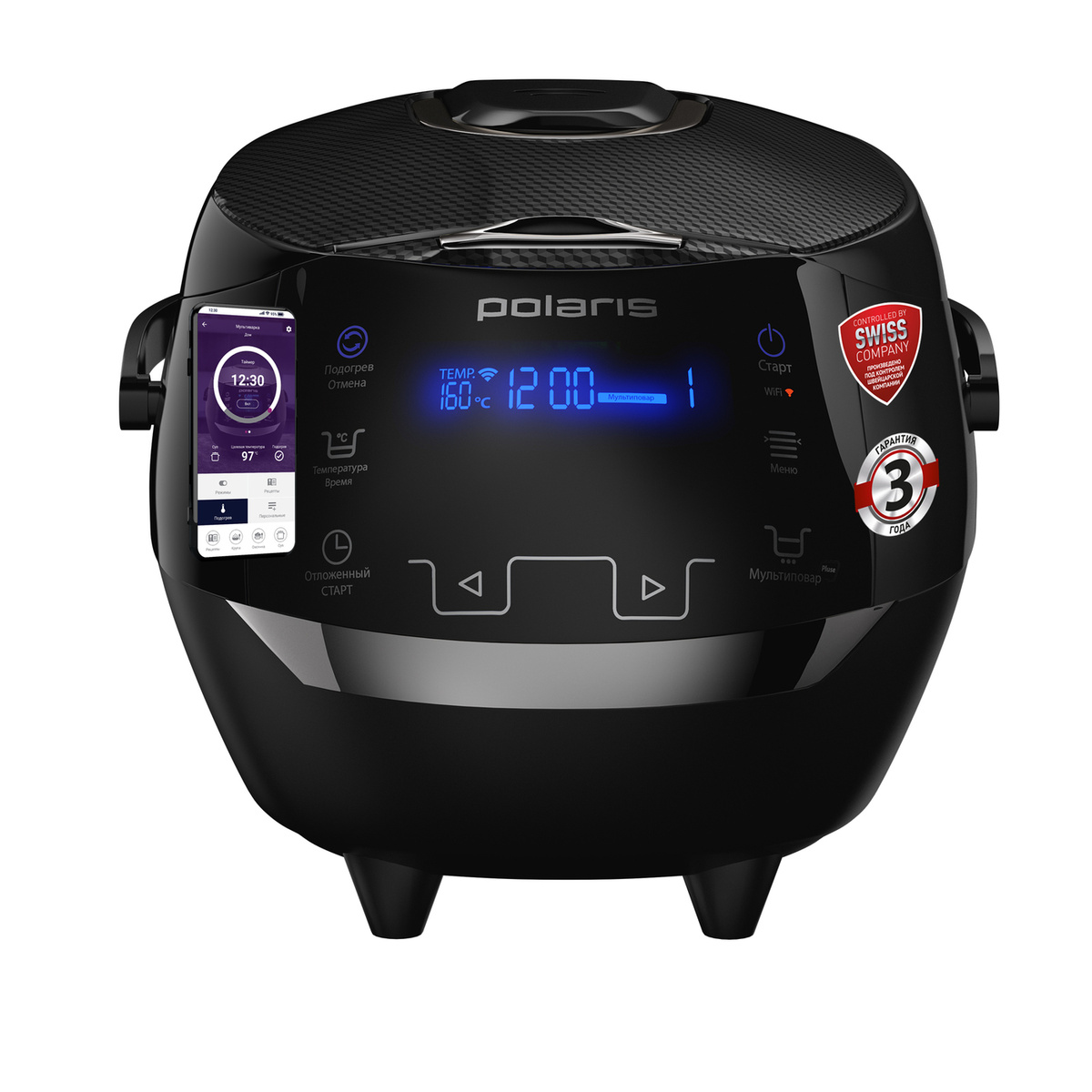 Тип - мультиварка; Программы - мультиповар, молочная каша, жарка, приготовление на пару, выпечка, тушение, плов, йогурт, крупа; Дополнительные функции - Sous-Vide; Отложенный старт - есть; Поддержание тепла - есть; Управление со смартфона - есть; Мощность - 860 Вт; Объем - 5 л; Антипригарное покрытие чаши - да; Цвет - черный; Количество программ - 21; Внутреннее покрытие чаши - антипригарное; Шири