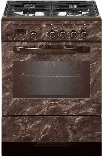 Цвет - коричневый, с рисунком "мрамор"; Габариты, ШхГхВ, см - 60x60x85; Фасад - закаленное стекло; Варочная поверхность - эмалированная; Решетки стола - чугунные; Крышка стола - стеклянная; Класс электробезопасности - I; Таймер - сенсорный; Газ-контроль духовки - есть; Газ-контроль горелок стола - есть; Электророзжиг духовки - встроен в ручку; Электророзжиг горелок стола - вст